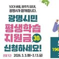 [경기핫타임뉴스=김삼영 기자] 광명시가 50대 중장년 시민의 배움 기본권 보장을 위해 올해도 평생학습지원금 지원을 이어간다. 시는 오는 3월 3일부터 13일까지 11일간 ‘2026년 광명시민 평생학습지원금’ 신청을 받는다고 26일 밝혔다. 광명시민 평생학습지원금은 생애 전환기를 맞은 50대 시민이 나이·소득·배경과 관계없이 배움을 지속할 수 있도록 생애 1회 1인당 30만 원의 평생학습이용포인트를 지원하는 사업이다. 시민 스스로 자신의 삶과 필요에 맞는 학습을 선택하도록 돕는 것이 핵심 목적이다. 박승원 광명시장은 “배움은 선택이 아닌 누구에게나 보장돼야 할 기본권”이라며 “시민이 나이나 환경의 제약 없이 언제든지 배움을 이어갈 수 있도록 평생학습 기반을 더욱 탄탄히 만들어가겠다”고 밝혔다. 신청 대상은 1967년 1월 1일부터 1976년 12월 31일 사이에 출생한 50대 광명시민이다. 광명시에 1년 이상 계속 거주했거나, 거주기간을 합산해 5년 이상 거주하고 있어야 한다. 시는 총 2천500명을 선정해 지원한다. 59세(1967년생)는 올해가 마지막 지원 대상임을 고려해 우선 선정하