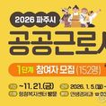 [경기핫타임뉴스=김형철 기자] 파주시는 오는 21일까지 2026년 1단계 공공근로사업 참여자 152명을 모집한다고 밝혔다. 공공근로사업은 청년, 여성, 중장년 등 취업 취약계층에게 한시적인 일자리를 제공하고, 장기 실직자에게 재취업 도전의 발판을 마련하는 데에 목적이 있다. 근무 분야는 ▲공공서비스 ▲전산화 ▲환경 정비 등 3개 분야, 147개 사업으로 구성돼 있다. 참여 자격은 ▲사업 개시일 기준 18세 이상 ▲가구소득이 기준중위소득 70% 이하 ▲재산 4억 원 이하인 파주시민이며, 파주시 등록 외국인도 신청할 수 있다. 참여 희망자는 모집 기간 내 거주지 행정복지센터를 방문해 신청서와 구비서류를 제출해야 하며, 선발 여부는 12월 말 개별 통보될 예정이다. 선발된 인원들은 내년 1월 5일부터 4월 24일까지 근무하게 되며, 주요 근무조건으로는 ▲시간당 임금 1만 2,070원 지급 ▲4대 보험 가입 ▲주휴수당 및 연차 유급휴일 제공 등이 있다. 이이구 민생경제과장은 “내년도 공공근로 일자리는 최근 어려워진 경제 상황을 고려해 최대한 많은 인원을 선발함으로써 민생경제 활성화