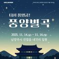 [경기핫타임뉴스=김형철 기자] 남양주시는 남양주시청년연합회가 오는 14일부터 16일까지 3일간 진접읍 내각리 일대에서 조선시대 4대 이궁 중 하나였던 ‘풍양궁’을 주제로 한 융복합 문화관광축제 ‘다시! 풍양궁 – 풍양별곡’을 개최한다고 밝혔다. 이번 행사는 잊혀졌던 풍양궁의 역사와 문화를 지역 주민과 함께 재조명하고, 역사·생태·문화가 어우러진 남양주형 관광 콘텐츠로 발전시키기 위해 마련됐다. 시는 이번 축제를 통해 시민들에게 지역의 정체성을 되새기고, 침체된 지역경제에 활력을 불어넣는다는 계획이다. 행사는 △풍양별궁 템핑(템플스테이+캠핑) △풍양마실 미션투어 △풍양장터 △창작뮤지컬 ‘풍양별곡’ 등 다채로운 체험 프로그램으로 구성된다. 특히 봉영사와 내각리 일대를 중심으로 펼쳐지는 ‘풍양별곡’은 주민이 직접 참여하고 체험하는 축제로, 방문객에게 색다른 역사 체험의 기회를 제공한다. ‘풍양별궁 템핑’은 봉영사 숲속에서 진행되는 힐링 체류형 프로그램으로, 템플스테이와 캠핑이 결합된 형태다. 참가자들은 봉영사 주지스님의 마음정화 설법, 천겸산 약수로 즐기는 꽃차담회, 별자리 관찰 등을 통해 자연과 전통이 어우러진 시