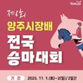 [경기핫타임뉴스=김형철 기자] 양주시가 오는 11월 1일부터 2일, 양주시 승마장에서 ‘2025 제6회 양주시장배 전국 승마대회’를 개최한다. 올해로 여섯 번째를 맞는 이번 대회는 전국 각지에서 150여 명의 선수와 90여 두의 마필이 참가해 열띤 경쟁을 펼칠 예정이다. 대회는 마장마술과 장애물경기, 초보 기승자 참여 가능 KHIS-6, KHIS-7 경기 및 이벤트 경기로 구성되어, 엘리트 선수부터 아마추어, 유소년까지 함께 즐길 수 있는 전국 규모의 승마대회로 개최된다. 시 관계자는 “양주시장배 전국 승마대회는 해를 거듭할수록 전통과 명성을 쌓아가고 있다”며 “많은 시민과 승마인들이 함께 즐길 수 있는 축제의 장이 되도록 최선을 다하겠다”고 전했다.